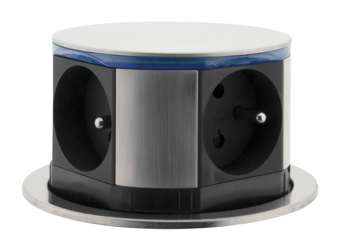 Bloc encastrable en plusieurs coloris pour cuisine et bureau équipé de toutes les prises nécessaires. Compacte et facile à installer, cette prise encastrable est équipée d'un système d'ouverture automatique par simple pression. Son faible encombrement permet de l'installer sans contrainte de place sous le bureau ou sur le plan de travail dans un trou de diamètre Ø100mm. S'installe à l'aide d'une scie cloche ou d'un trépan mais également à l'aide d'une simple perceuse grâce au gabarit de pose fourni (bague de fixation). Câblée en H05VV-F 3G1,5mm² de longueur 1,5m. Puissance max 3680 W sous 230 W. Dimensions du produit ouvert : Ø 16 x 11.5 cm. Dimensions du produit fermé (prises non visibles) : Ø 10.3 x 11.5 cm.